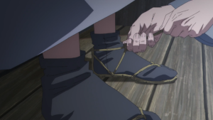This may seem like efficient footwear but in reality, this reveals a lot about Naoya, mainly that he is ultimately a codependent manchild.