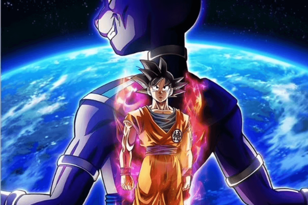 The key visual features Goku’s Super Saiyan God form and Beerus behind him.