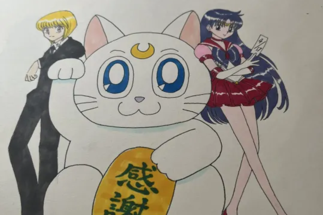 On the tweet, we get an illustration of Kurapika together with a giant lucky cat figure version of Artemis, and Sailor Mars.