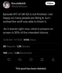 A freelance animator named RocciaNobili, who worked on Jujutsu Kaisen Season 2 episode 17 (which featured Sukuna vs Mahoraga) as an animation director, posted on Twitter, on Nov 17, 2023, that “the episode is not finished,” further stating that only 30% of the intended vision was achieved due to time constraints.
