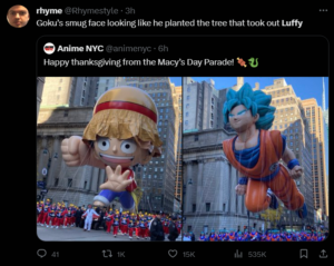 One Piece fans around the world were thrilled to see a huge Monkey D. Luffy float floating around the skies of New York City, as Luffy made his official debut in the 97th Macy’s Thanksgiving Parade, held on Nov 24, 2023, joining Son Goku from the Dragon Ball franchise.