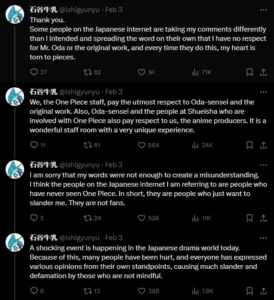 While replying to a fan comment, Ishitani remarks that the One Piece anime staff members have utmost respect for Oda and his manga and further notes that the people at Shueisha, who are involved with One Piece, also pay respect to them. She later apologized for creating a misunderstanding amongst the Japanese One Piece fandom with her posts and kindly requested that they not take her words in the wrong way.