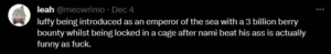 On the other hand, Nami fans found this the chance to hilariously gaslight her as being stronger than a Yonko, saying that Nami is stronger than even the admirals.