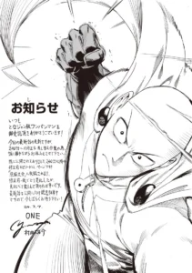 “Thank you for reading Tonari No Young Jump’s One Punch Man! Regarding the release of the latest chapter (chapter 203), we are sorry to inform you that we will take a short break in order to revise and replace all chapters starting from chapter 195. These chapters that have already been published will be included in the “Complete Manuscripts” section of the bottom of this page. We hope you will enjoy comparing how the chapters were changed before and after the revision. We are working hard to publish the latest chapter, so please wait for a while!”