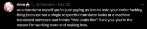 Another translation argued that the “hidden” reason behind this maneuver, is cost-cutting. Translators are already being paid less, according to this person, and combining AI would just make them earn even less. Furthermore, no translator respects machine-generated translations as a viable option, so that’s why it’s stupid for such companies to almost take away their jobs.