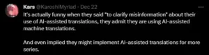 Fans on social express their concern over AI-generated translations, saying that they won’t be of high quality and it takes away jobs.