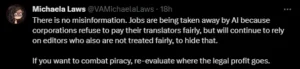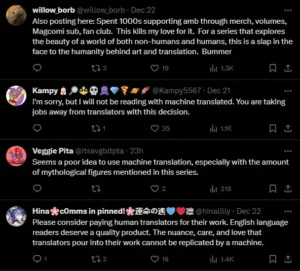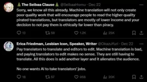 Fans on social express their concern over AI-generated translations, saying that they won’t be of high quality and it takes away jobs.