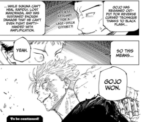 It was clear from Gojo’s perspective that after destroying Mahoraga, which was able to adapt to Infinity, Sukuna would have no other ace by this point and was thoroughly injured