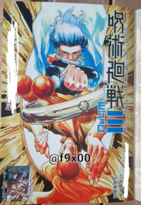 The cover features Yuka at the top summong Mahoraga and below is Tsurugi fusing with the Shikigami Rika, while both Yuta’s ring and Mahoraga’s wheel are joined together.